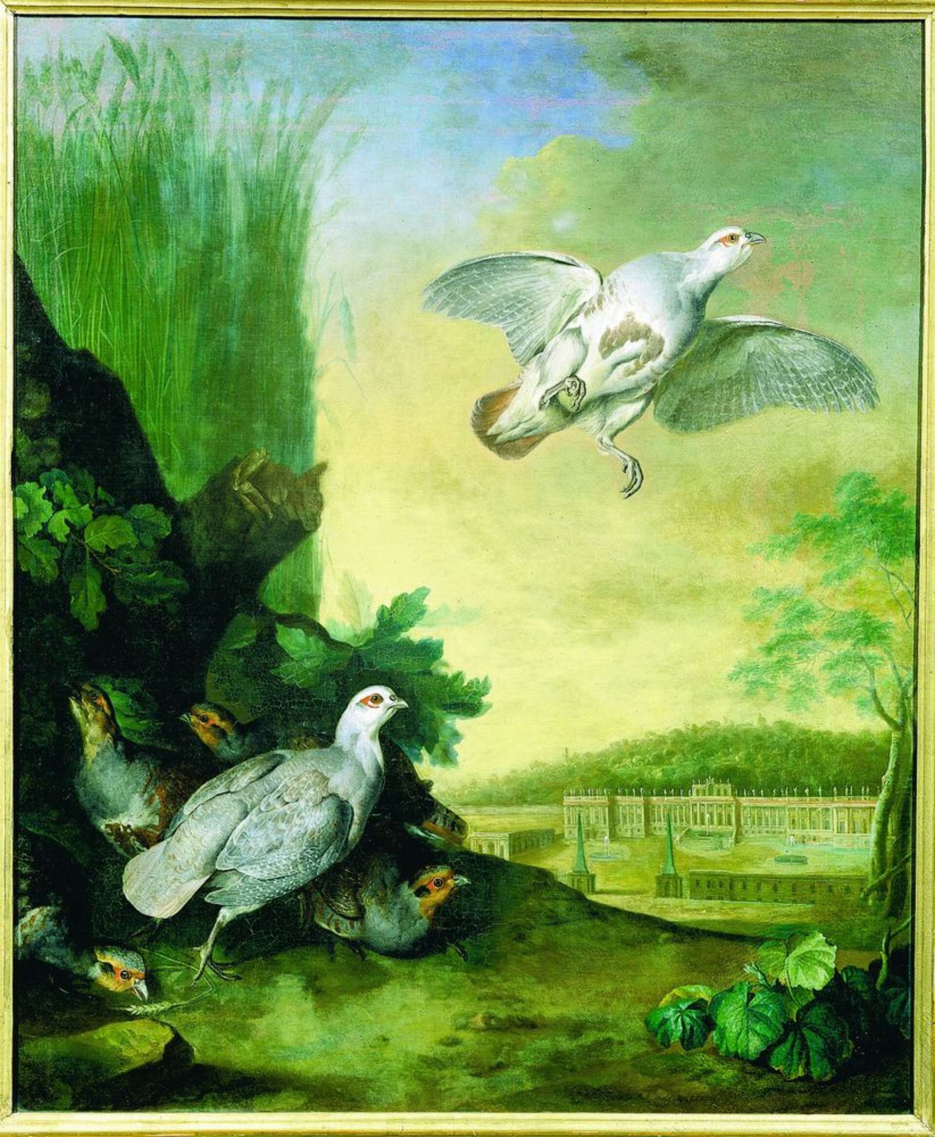 Das Gemälde Rebhühner vor Schönbrunn von Johann Georg Hamilton, datiert 1732 stellt eine bedeutende Bildquelle dar. Es zeigt das Jagdschloss Fischers mit seiner ausladenden Freitreppenanlage und dem statuenbesetzten Flachdach im Hintergrund des Gemäldes, im Vordergrund sind Rebhühner dargestellt. Das Gemälde ist nicht nur Jagdstück; die symbolhafte Darstellung der einzelnen Elemente bildet eine Apotheose auf die gute Regierung des Kaisers, die dem Staat und dem Volk Wohlfahrt und Reichtum bringt. Das Schloss dient als Symbol der Regentschaft, die Rebhühner im Vordergrund als Symbol der Fruchtbarkeit, das Weizenfeld steht für Überfluss und das Baumskelett, aus dem ein grüner Ast sprießt, für neues Leben.