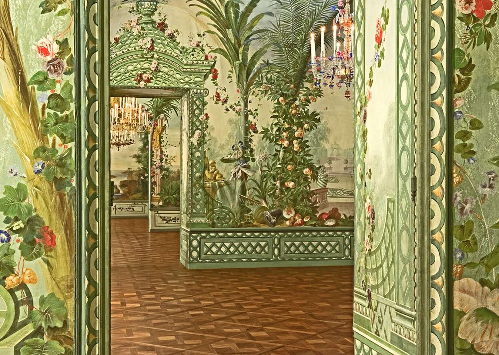 Diese sogenannten Bergl-Zimmer zeichnen sich durch die - großteils exotischen -Landschaftsmalereien aus, die sämtliche Wand- und Wölbeflächen überziehen und einzigartige Beispiele für Illusionsmalerei darstellen.