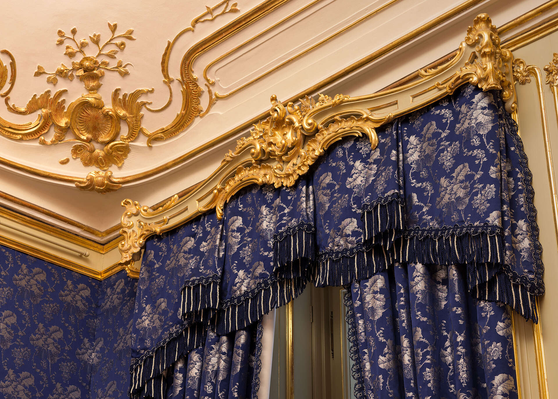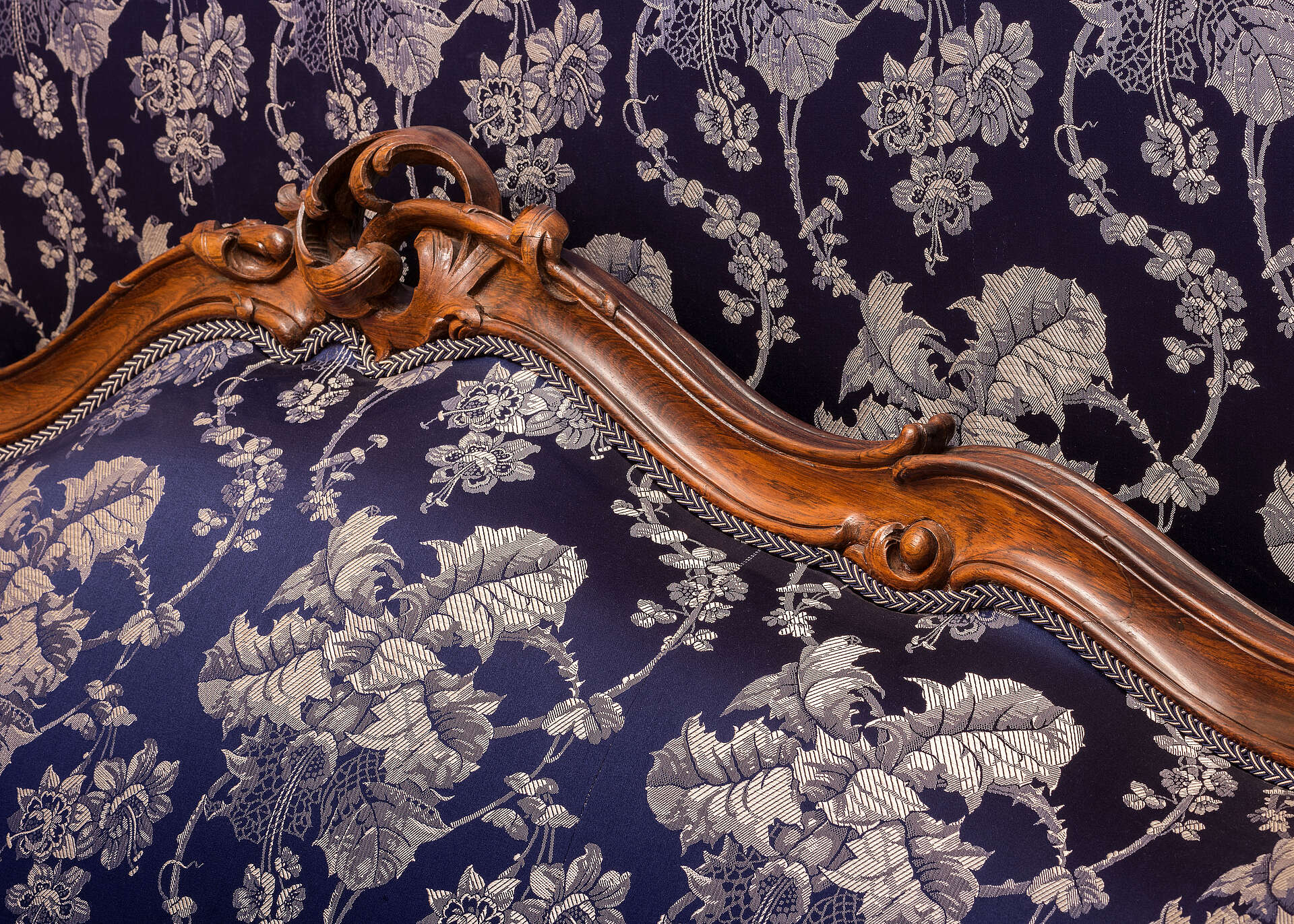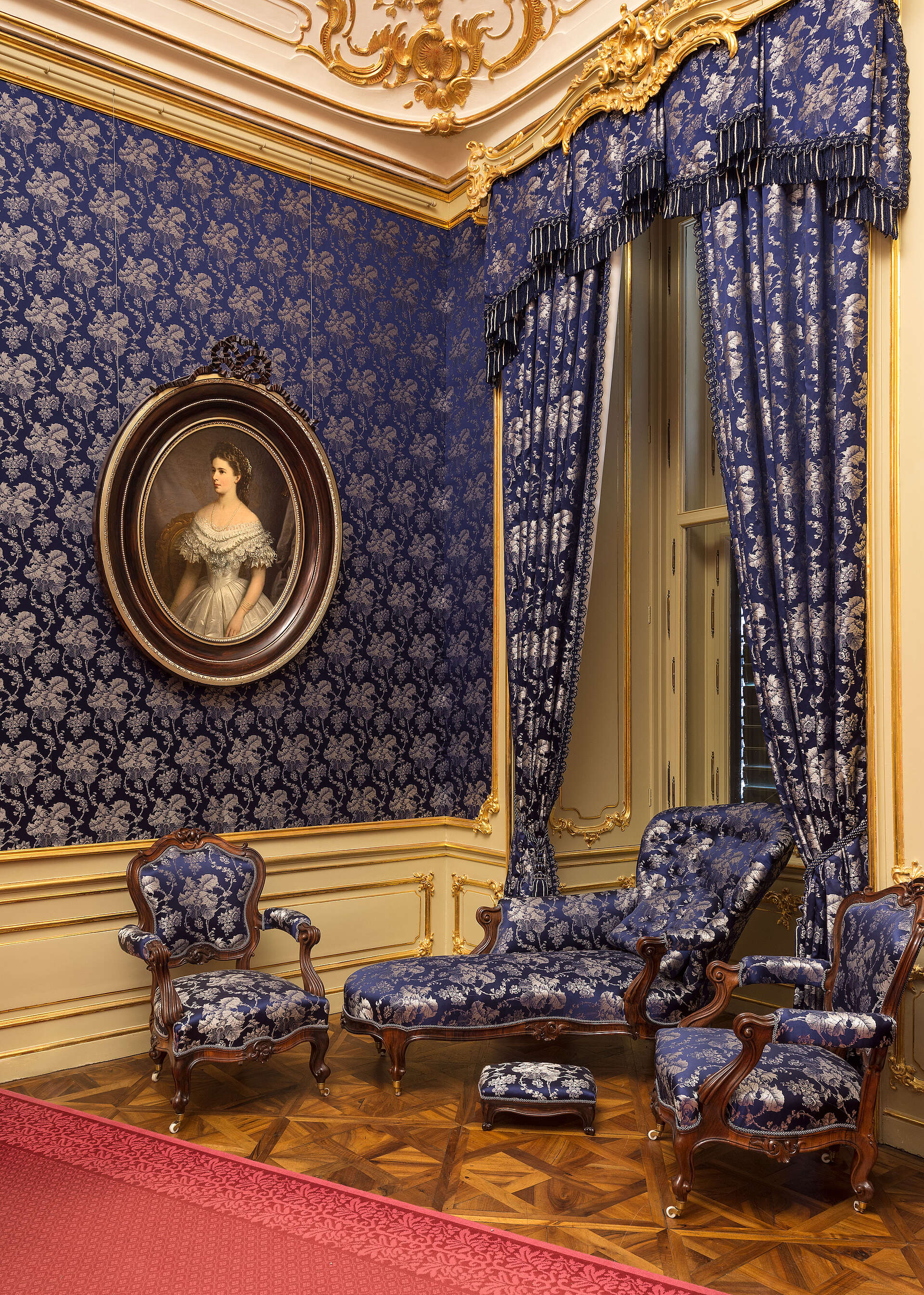 Die schweren Palisandermöbel sind in den üppigen Formen des Zweiten Rokokos gehalten, einem Stil, der die Möbelkunst der Mitte des 19. Jahrhunderts dominierte. Die Sitzmöbel wie auch die Wandfelder sind mit einem tiefblauen Seidendamast mit eingewebten weißen Blütengirlanden bespannt. Anlässlich der Raumrestaurierung im Jahr 2014 wurde die textile Ausstattung dieses Raumes nach historischen Vorlagen rekonstruiert, sodass der Raumeindruck heute wieder dem Zustand zur Zeit der Bewohnung durch das Kaiserpaar entspricht.