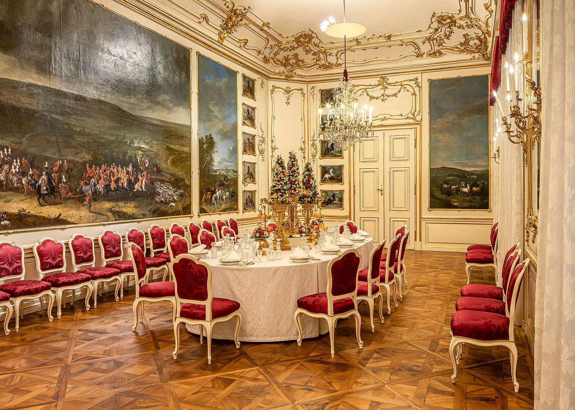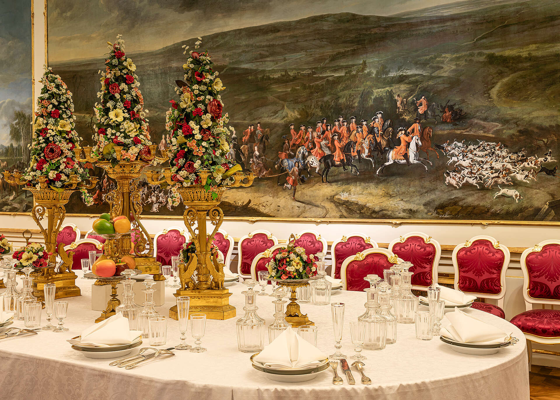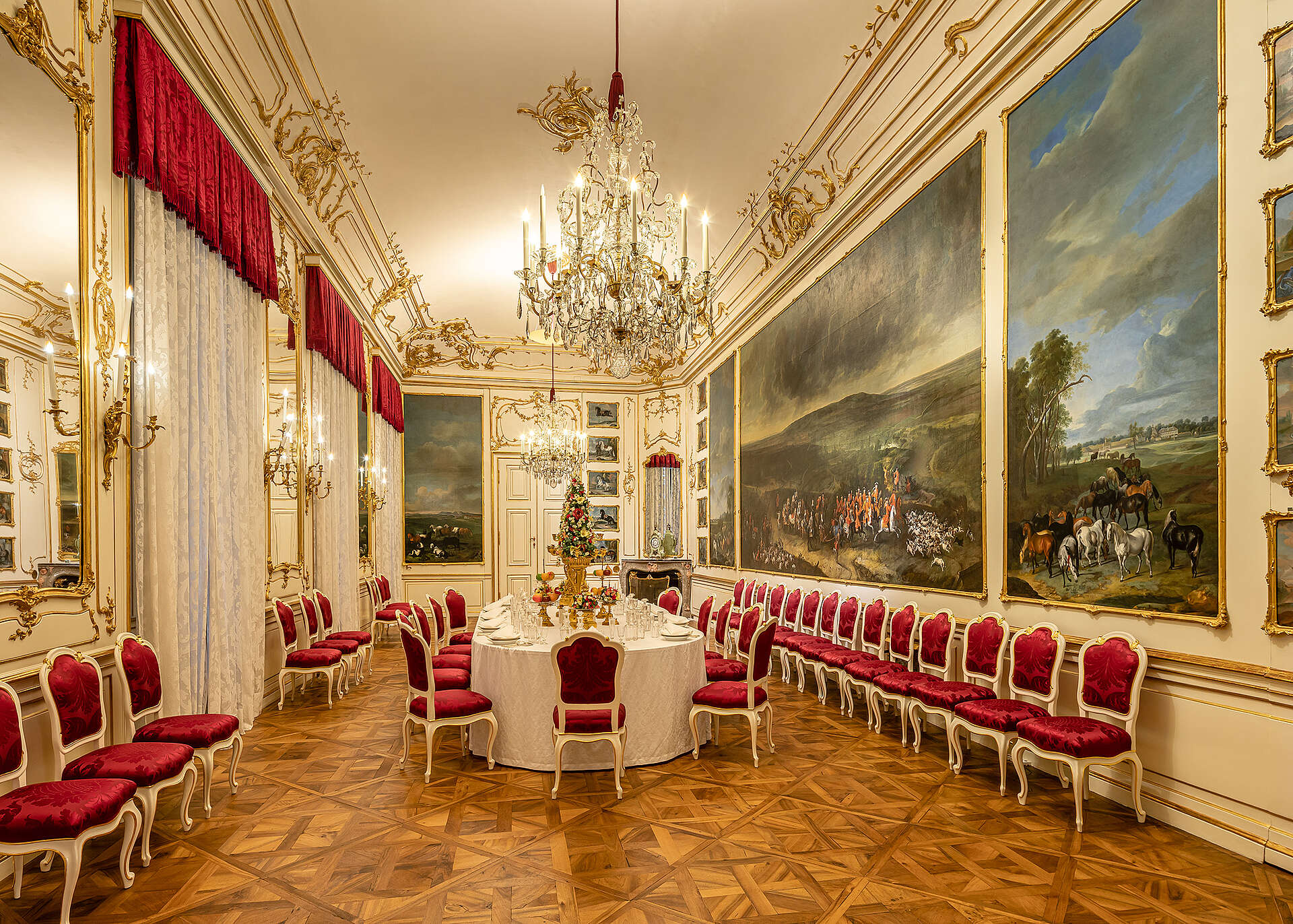 Das Rösselzimmer diente im 19. Jahrhundert als Tafelzimmer. Daher ist heute hier eine festlich geschmückte Tafel zu sehen, die getreu einer Ansicht des Raumes aus der Mitte des 19. Jahrhunderts gedeckt wurde.
