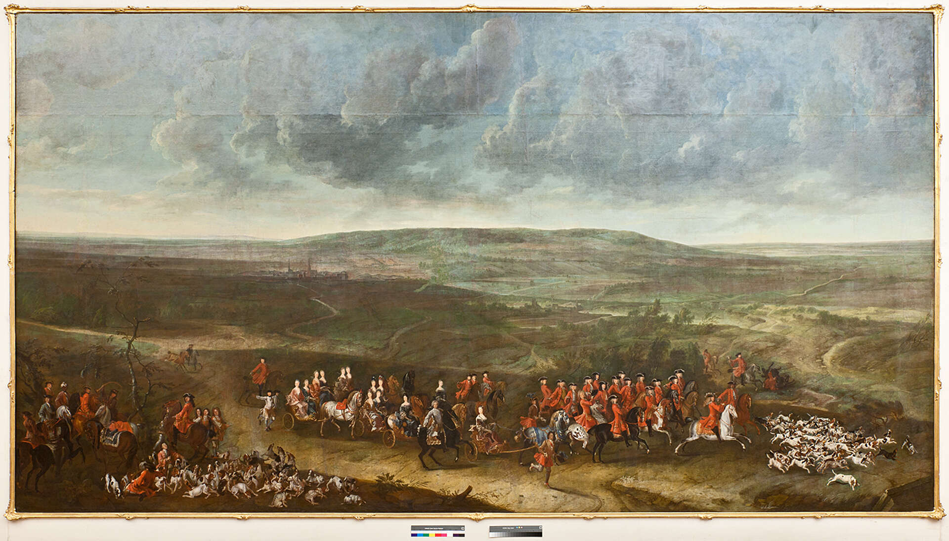 Das zentrale Gemälde zeigt eine Parforcejagd in den Marchauen östlich von Wien. Abgebildet ist inmitten seines Gefolges Kaiser Joseph I., für den Schönbrunn um 1700 als Jagdschloss errichtet wurde.  Das großformatige und durch seine Detailtreue bestechende Gemälde wurde von Phillip Ferdinand (1664–1750), einem Bruder Johann Georgs und weiteren Angehörigen der Malerdynastie der Hamiltons, die für ihre außergewöhnlich lebensechten Tierdarstellungen bekannt waren, um 1707 begonnen. Nachdem das großformatige Gemälde jedoch zunächst unvollendet blieb, wurde es 1752 von Johann Martin Rausch (1698–1773) fertiggestellt.