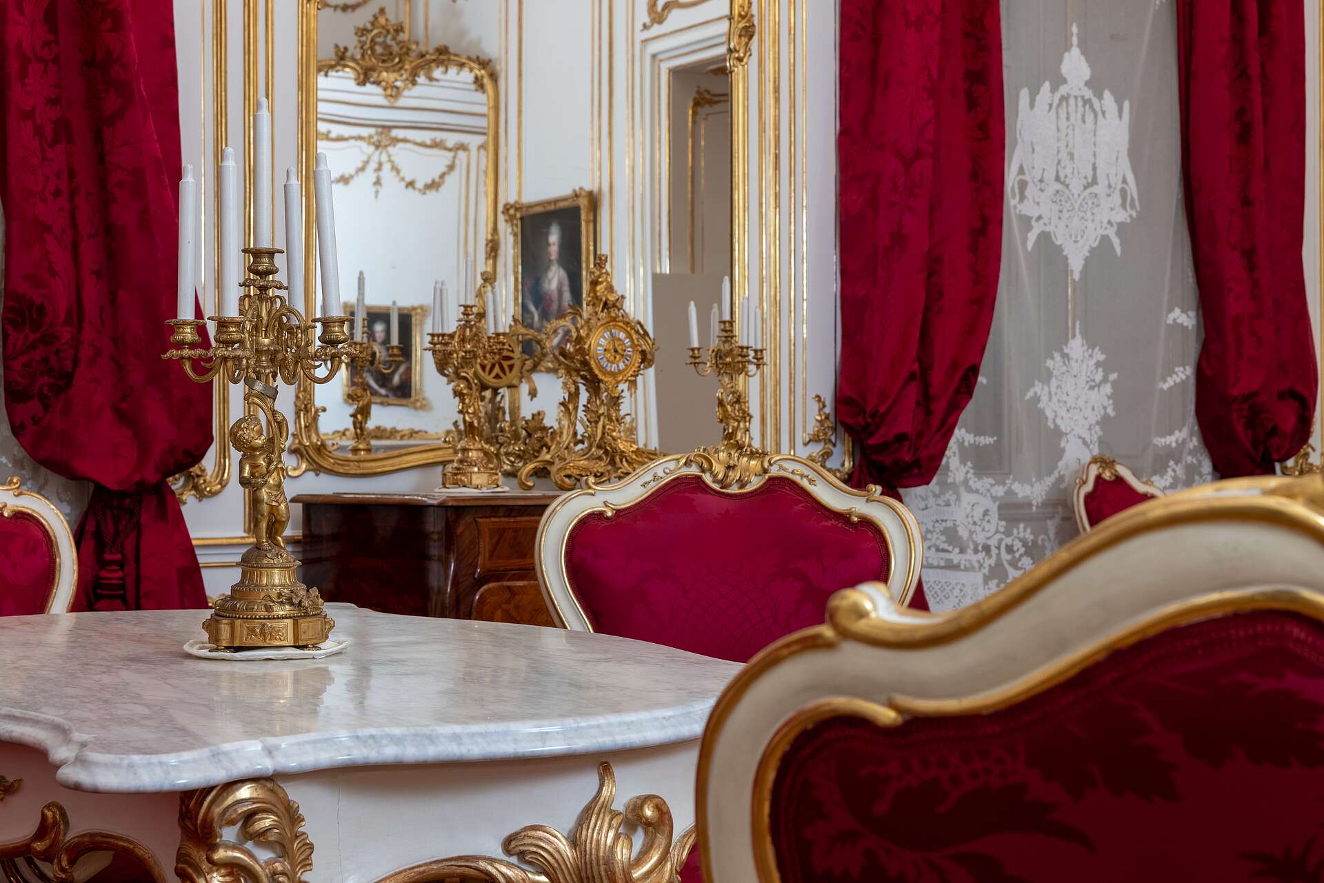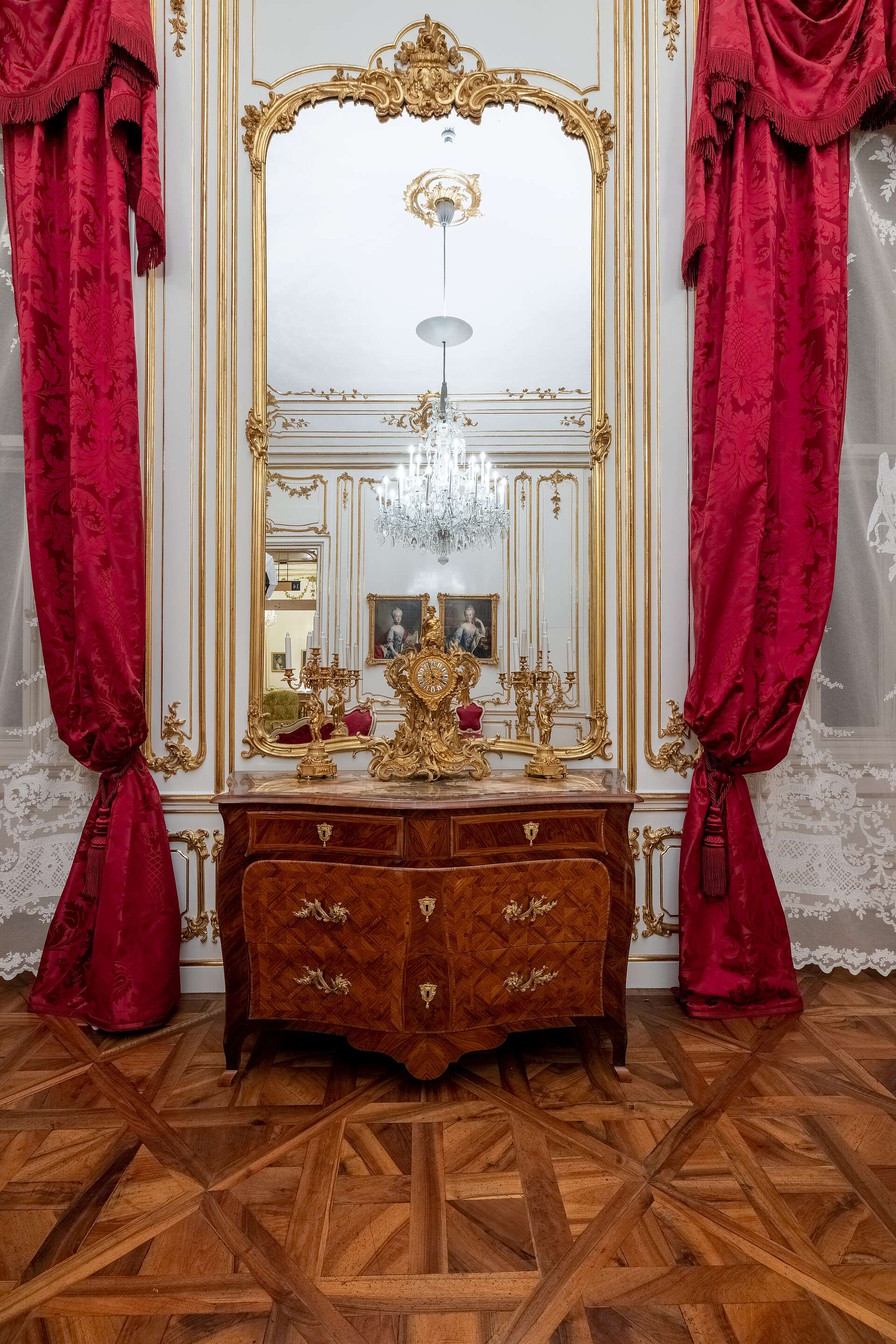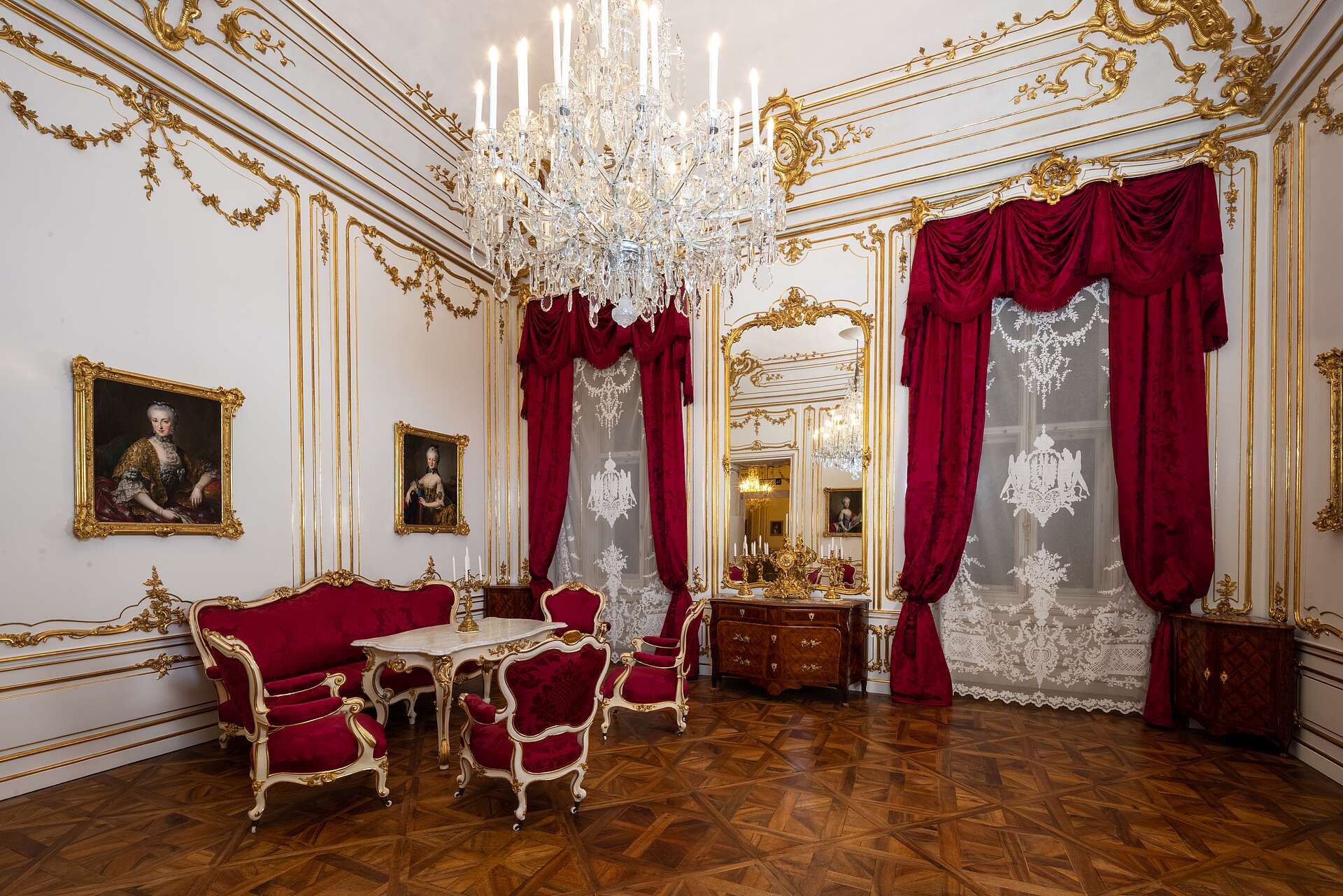 Maria Theresia, deren Porträt in der Mitte des Raumes auf einer Staffelei aufgestellt ist, war die Ur-Urgroßmutter von Kaiser Franz Joseph und regierte von 1740 bis 1780. Sie war Mutter von sechzehn Kindern – sie schenkte elf Töchtern und fünf Söhnen das Leben.